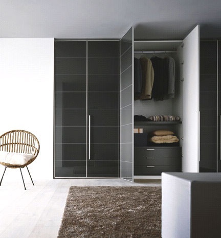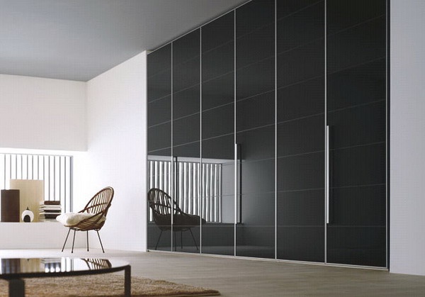 Storage system from the Italian manufacturer Novamobili. Storage of clothes and shoes consists of shelves hidden behind doors. The frame is made from solid wood. Doors made of tinted glass. Color scheme in black. Good solution for modern interior.