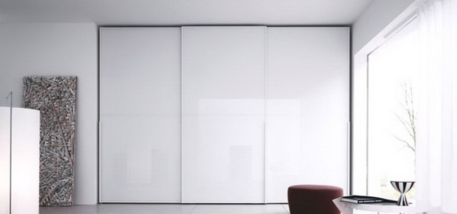 Storage system from the Italian manufacturer Novamobili. The system of storage of clothes and shoes which consists of storage shelves hidden behind sliding doors. The frame is made from solid wood, doors made of tinted glass. Color scheme in white color, doors with pale grey patterns. The perfect solution for modern interior.