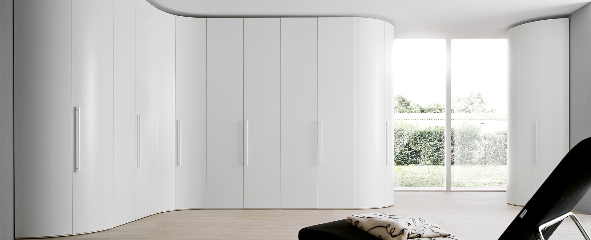 Alfa wardrobe system from the Italian manufacturer Novamobili. The case is MDF wood. Handles - metal. Storage of clothes and shoes consists of shelves and drawers hidden behind doors. The system is located in figure line with a semicircular shape. Color scheme in white color. An interesting solution for modern interior.