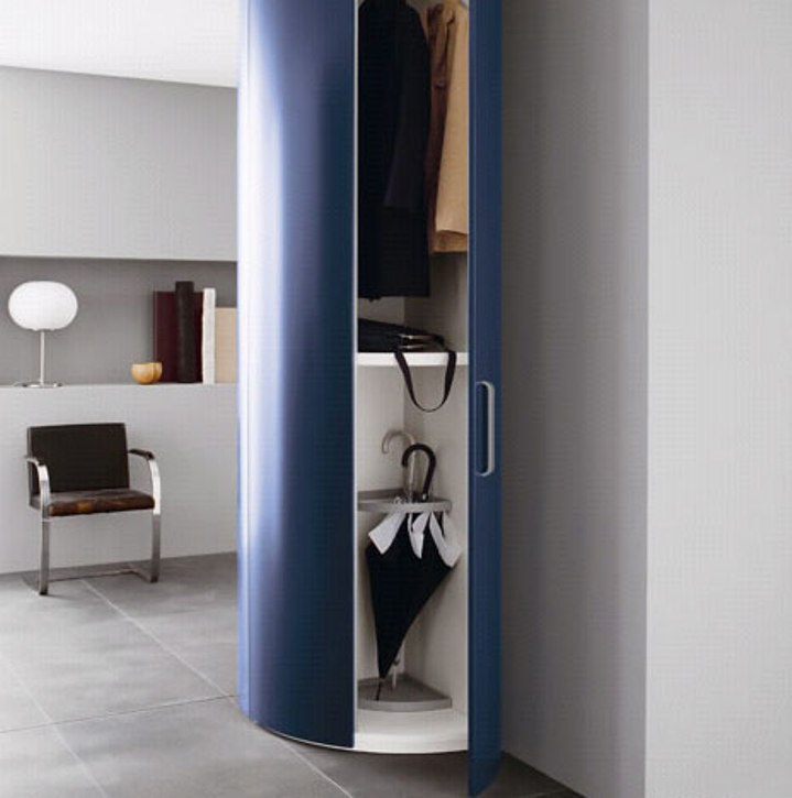 Storage system from the Italian manufacturer Novamobili. Storage of clothing and shoes is located in figure line with a semicircular shape. Consists of shelves and drawers hidden behind hinged doors. The frame is made from solid wood. Made in purple color. The perfect solution for modern interior.