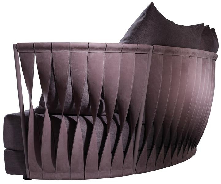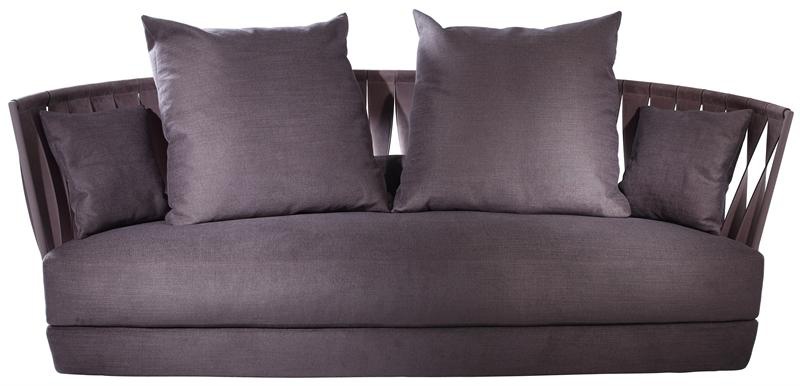 Twist loveseat sofa from Italian manufacturer Cantori. Model with a rounded back. The frame is made of metal. Upholstery textile or leather. There are several color options. Decoration serve a decorative ribbon. The filling of the pillows is not deformable polyurethane foam. Complement the design of decorative pillows.