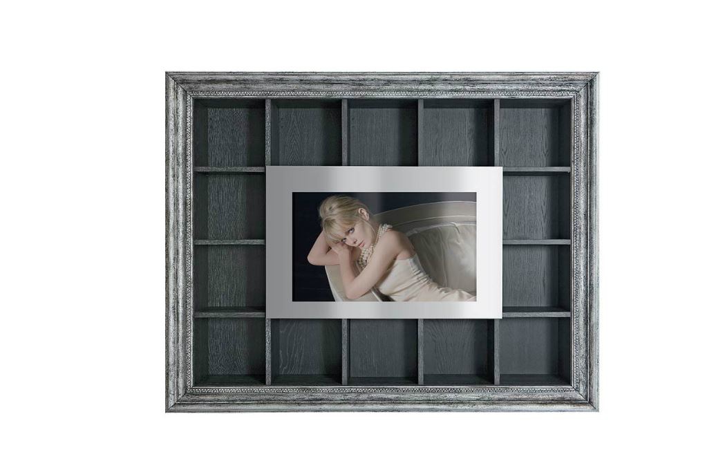 Wall shelf for books Casablanca with a plasma TV built into the mirror from the Italian manufacturer EGO. Frame and shelves made of solid oak. Model with lots of open shelves and built-in "magic mirror". "The magic mirror" uses a patented LED technology. To use the mirror directly, it helps to turn off the TV.Shelf ornate carved frame. Shelves are displayed in grey colour with silvering, made in art Deco style.