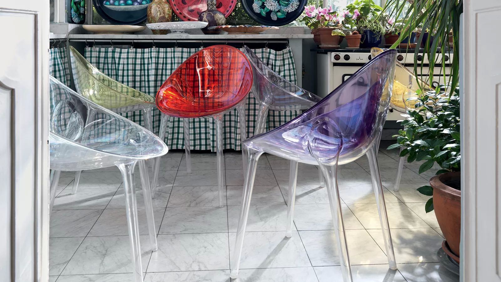 Mr Chair. Impossible from the Italian manufacturer Kartell. The frame is made from colored polycarbonate. Pretty model for dining room in modern style. Colours in stock.