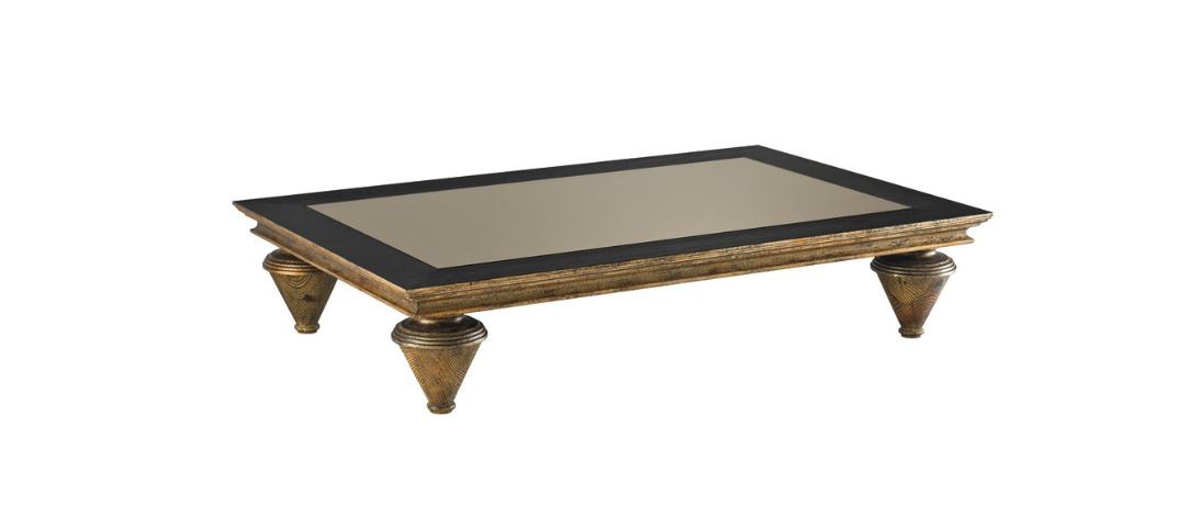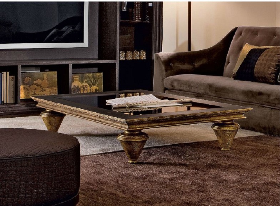 Piccadilly coffee table produced by the Italian factory EGO. The frame is made of solid oak. Rectangular table top with glass surface on decorative carved legs. The top and legs painted in Golden colour with vintage effect. The model is made in art Deco style.