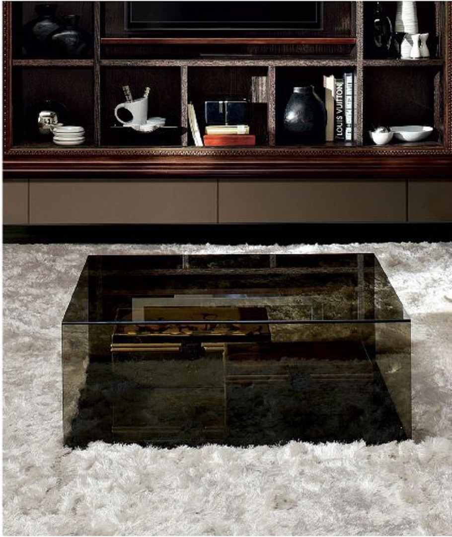 Square coffee table Domino production EGO. A table made of glass. The model is presented in grey. The variant in the bronze color. The product is designed in modern style.