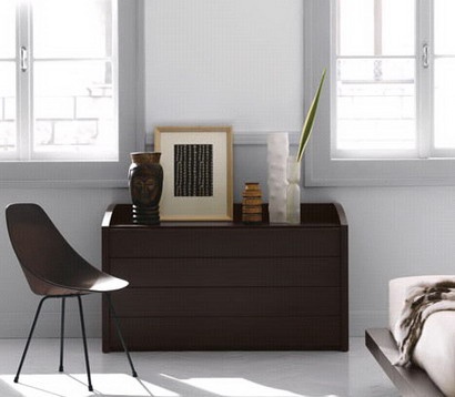 Set for sleeping from the Italian manufacturer Novamobili. Consists of double bed on low legs, bedside cabinets and dresser. The frame is made from solid wood. Color in brown tone. The perfect solution for modern interior.