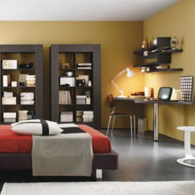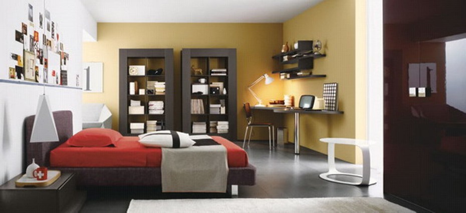 Set for sleeping from the Italian manufacturer Novamobili. Consists of double bed, bedside tables, rack, computer table, wall shelves and chest of drawers. The frame is made from solid wood. Colors in dark brown. The perfect solution for modern interior.