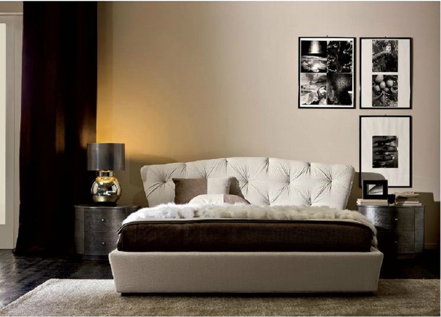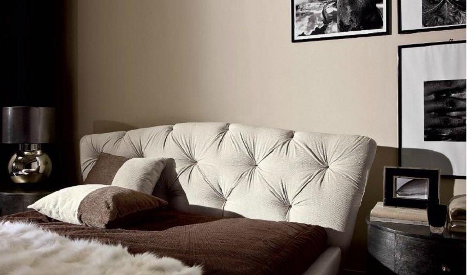 Ginevra bed from Italian manufacturer EGO. The frame is made from solid wood. On the bed four little oak legs. The upholstery is leather or textile, in the catalog of the manufacturer. The headboard is low, soft, decorated with furniture nails. The model is executed in modern style.