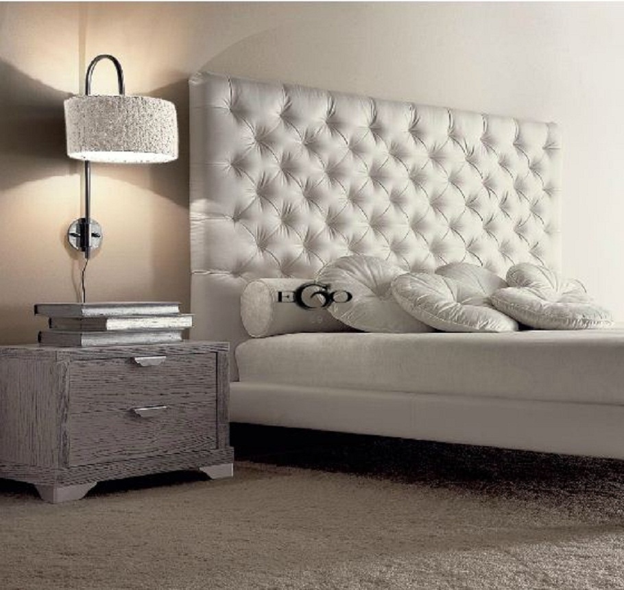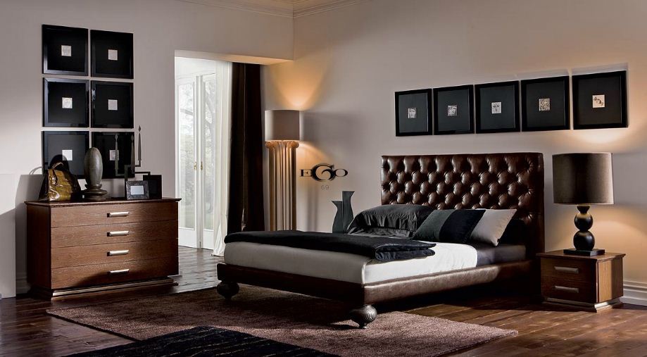 Domingo bed from Italian manufacturer EGO. The frame is made from solid wood, upholstery leather. Bed with high upholstered headboard, decorated furniture nails. Legs at the foot of the massive figure, made of oak.