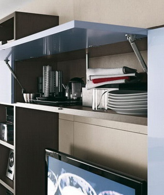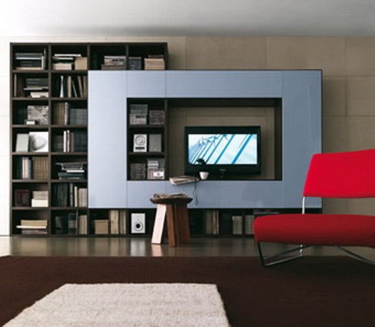 Wall with space for TV from the Italian manufacturer Novamobili. The frame is made from solid wood. The furniture consists of wall shelves. Place to install the TV with all necessary accessories. The system is designed in a contemporary style.