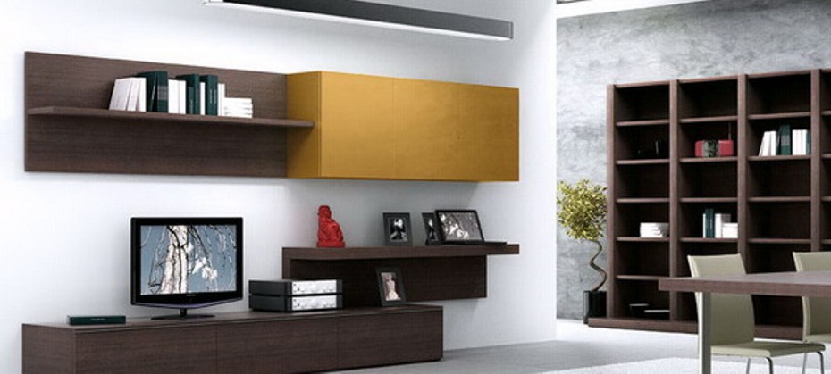 Modular system for TV from the Italian manufacturer Novamobili. Presents living room furniture in modern style with open and closed shelves, and drawers for storage. Place to install the TV with all necessary accessories. The frame is made from solid wood. Color beige and brown. Finish to be selected from the range of the company.