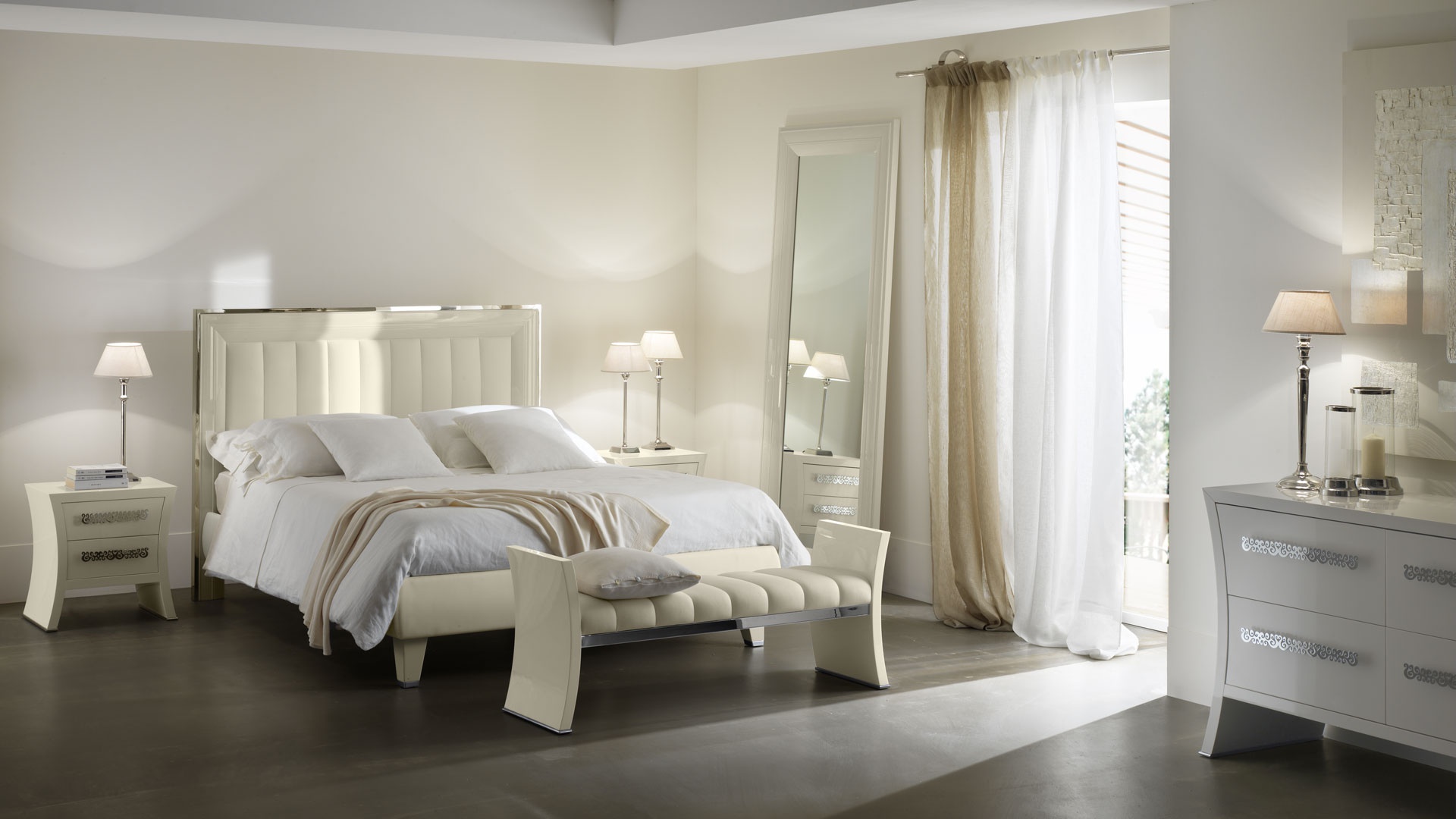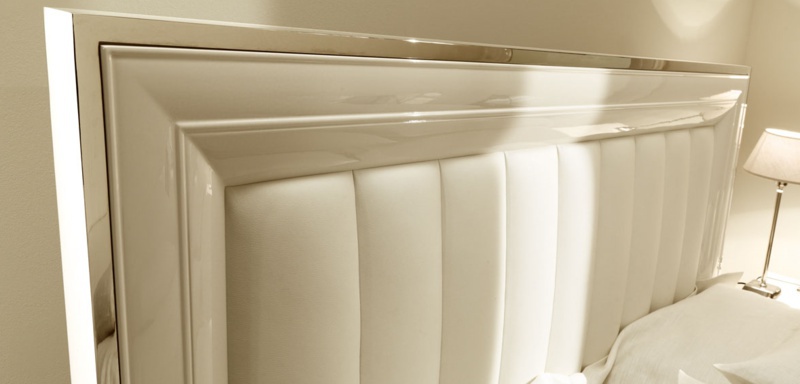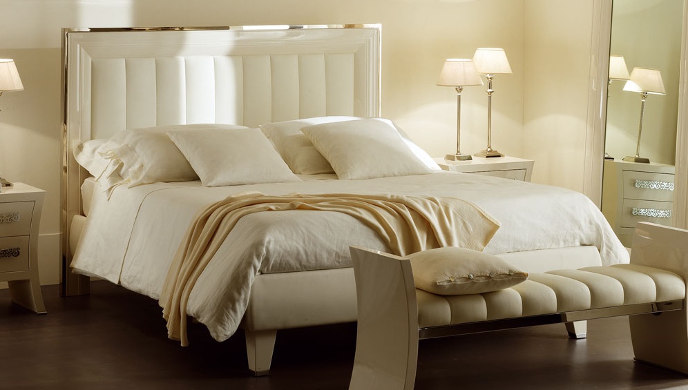 Richard double bed from Italian manufacturer Cantori. The frame and legs are made from soft and firm breeds of a tree. Headboard with outer metal frame. Legs from solid wood with brass moulded edges. Upholstery of textile leather or white. Decoration is the fringing of Golden color. The model is made in a modern style.