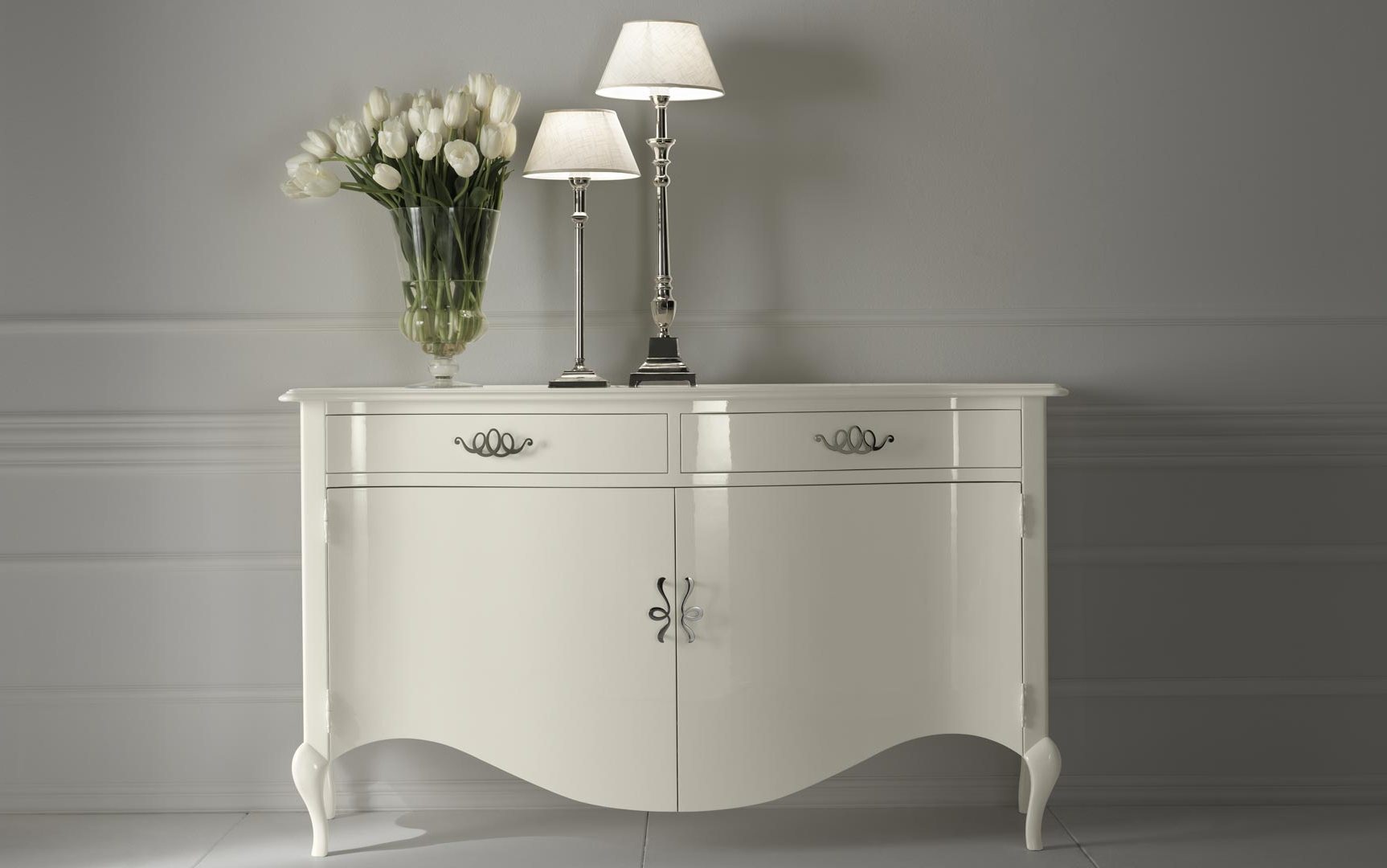 Raffaello D a chest of drawers from Italian manufacturer Cantori. The model includes two drawers and partitions with swinging doors. Body and curly legs made from solid wood. The finish offers a glossy varnish. Decorative metal fittings.
