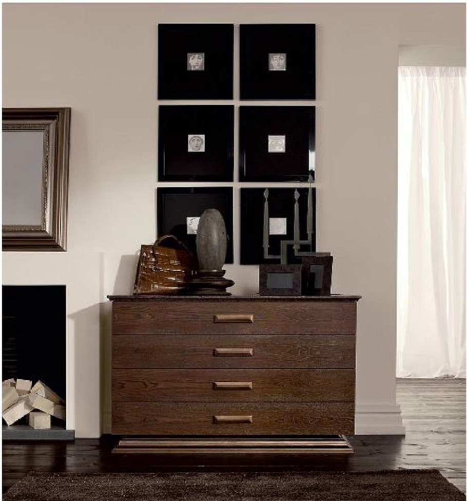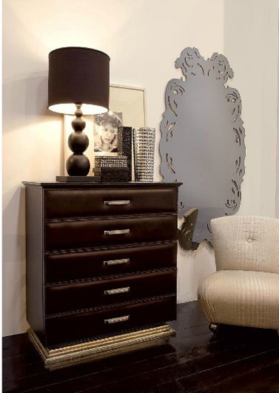 Dresser Rudy produced by the Italian factory EGO. The frame is made of solid oak. The model with five and four drawers. Complemented by a bedside table. The boxes can be trimmed with leather to match the chest of drawers, furniture metal, silver. The dresser is made in art Deco style.