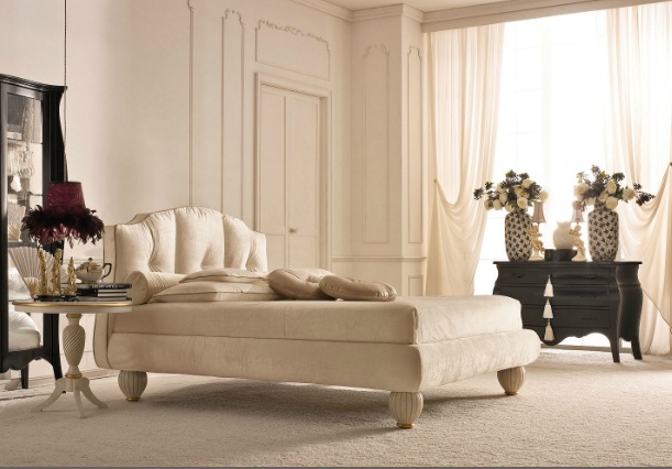 Headsets for bedrooms from the Italian manufacturer Giusti Portos. Includes double bed, two bedside tables and a chest of drawers. Skeleton models made of solid wood. The bed is decorated with soft headboard in fabric with padding. The trim is made of ivory.