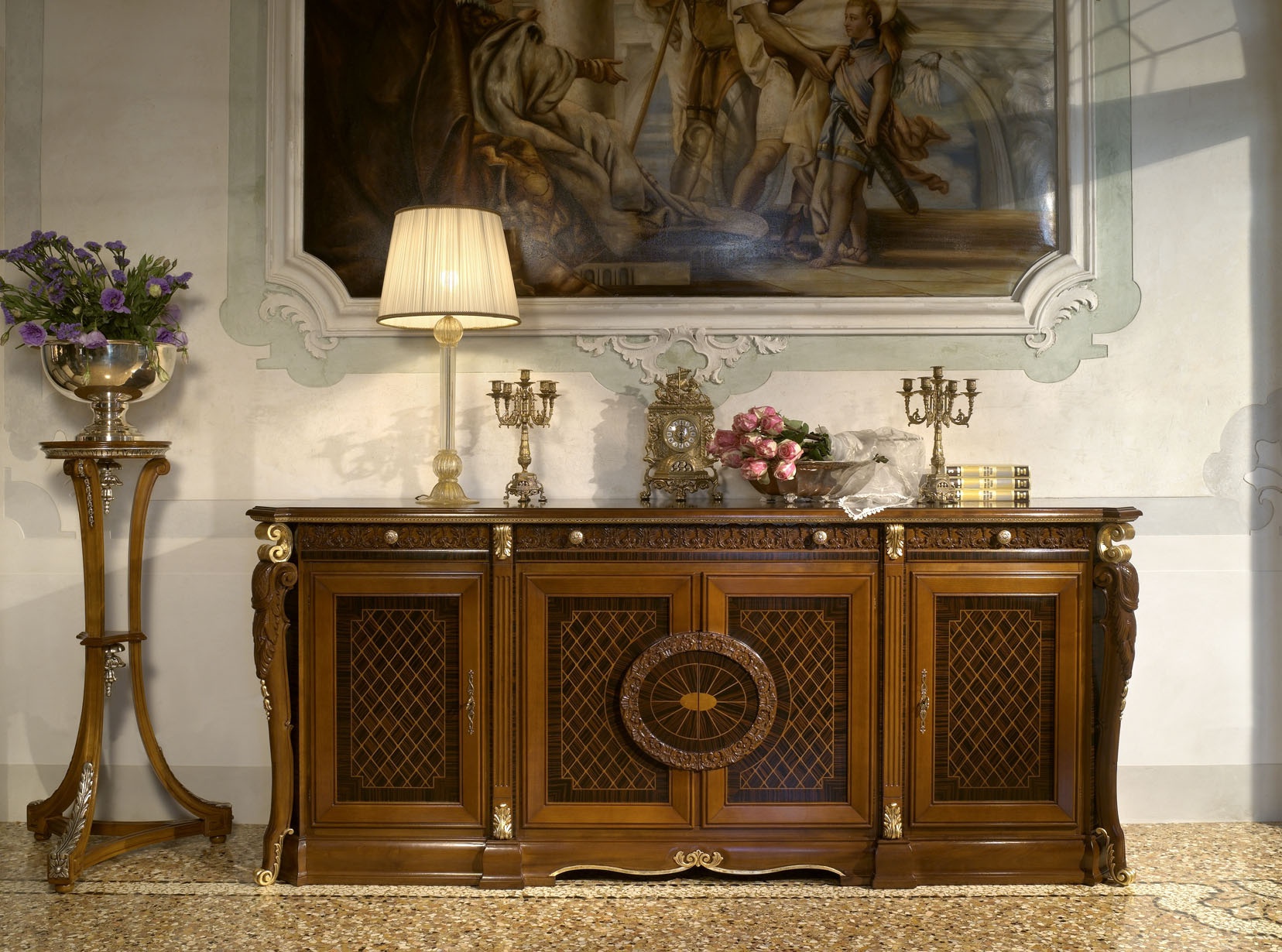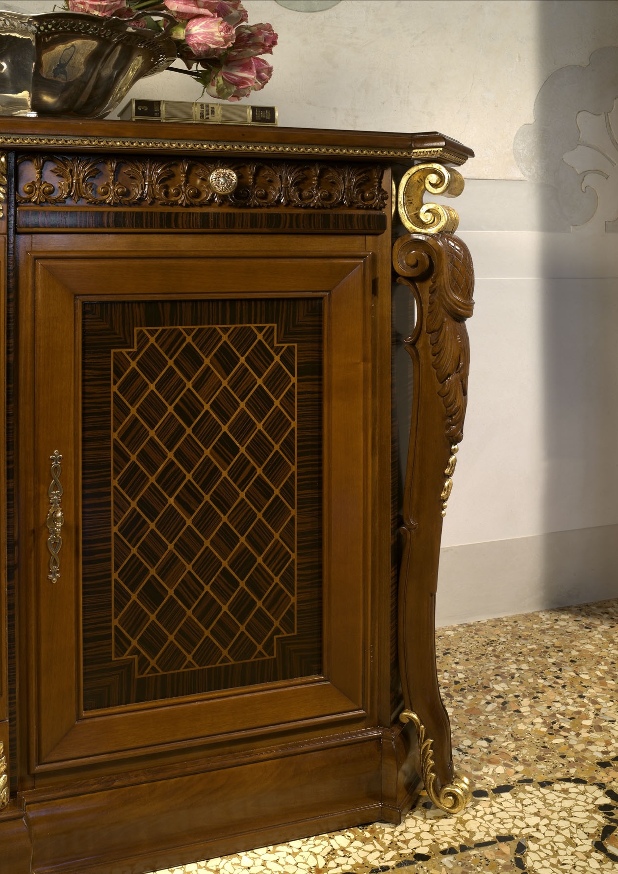 Classic sideboard from the Italian manufacturer Arca. The model is made of cherry with ebony accents. Finishing - gilding. Sideboard with drawers and hinged doors. A chic choice for interior in classic style.