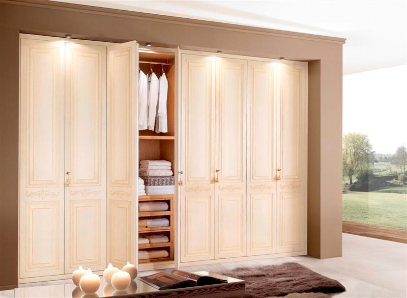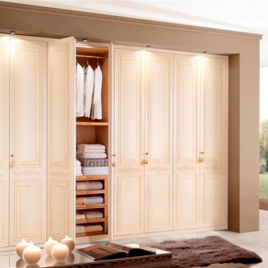 Wardrobe Donatello from the Italian manufacturer Benedetti. The frame is made from tamburino. The model is decorated with inlay. Cabinet with built-in lighting. Perfect choice for classic style. Colors: white, beige.