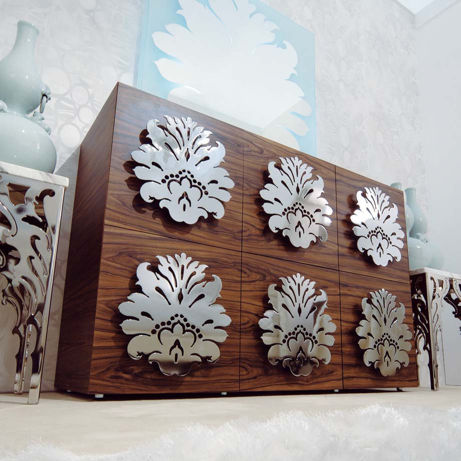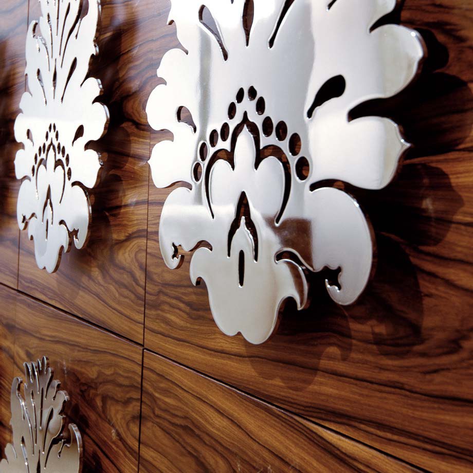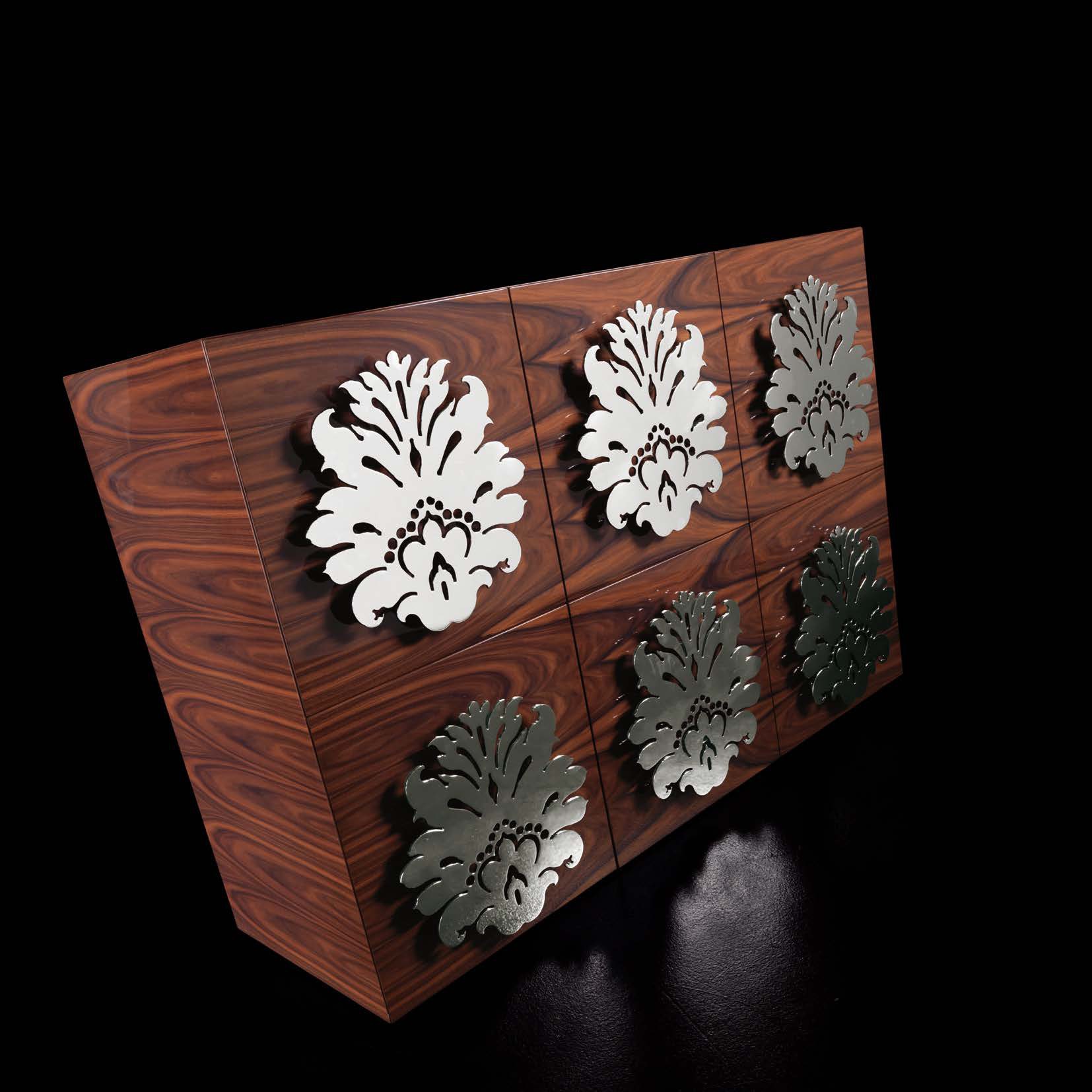 The Damasco chest of drawers from Italian manufacturer JC Passion. The frame is made from solid rosewood in a matte or glossy finish, legs and decorative elements - Nickel plated steel. A great model for living room in art Deco style. Product color natural wood.