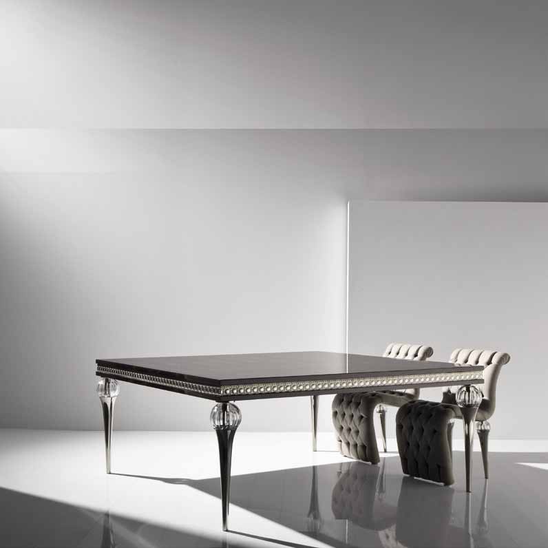 Set for the dining room from Italian manufacturer, JC Passion. Set includes square dining table shape and chairs. The furniture is made of solid wood. Legs - metal. The chairs filler - foam, upholstery - textiles from a range of campaigns. The tabletop is treated with glossy varnish. Set in an art Deco style. Colors: dark, white.