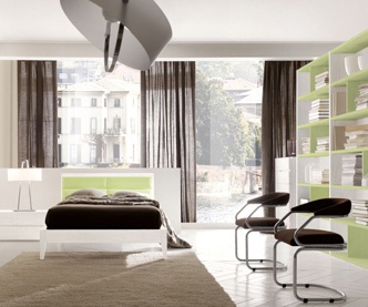 Set for teen rooms Teenager from the Italian manufacturer Benedetti. Set includes double bed with high headboard and a soft, bedside tables, shelving and chairs with armrests. The furniture is made of MDF and tamborito. The upholstery of the chairs - the fabric is from a range of campaigns. Set in a contemporary style. Colors: white, green, brown.