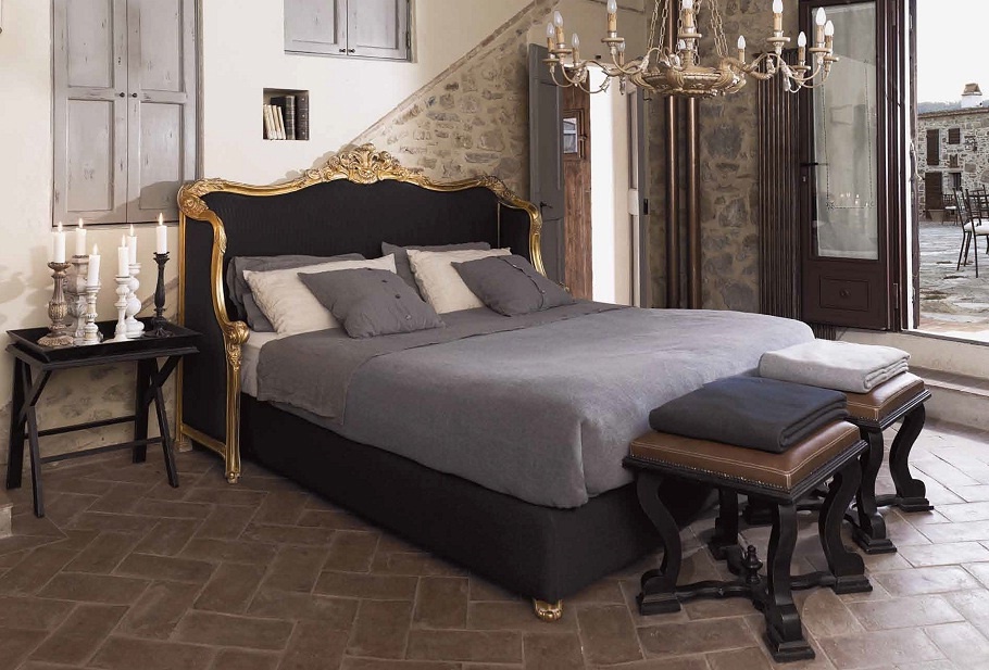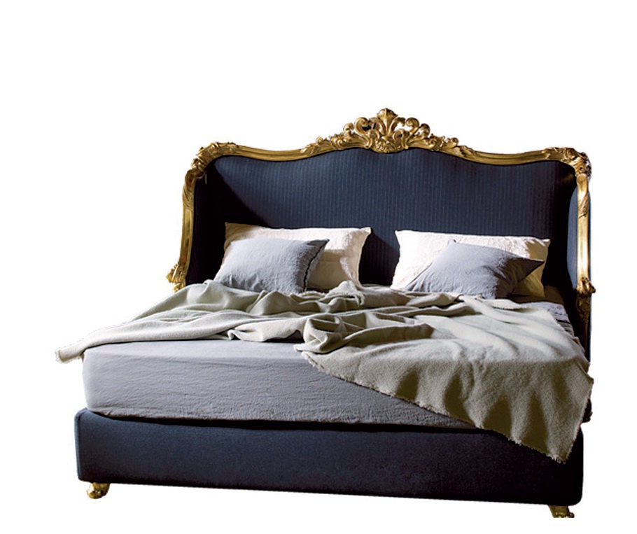 Double bed from Italian manufacturer Chelini. The model is made in classic style. Frame and shaped legs in solid wood. Offered finish with gold leaf. The body and headboard are covered with textiles. Color option to choose from a range of companies. Decoration is the decorative carving handmade.