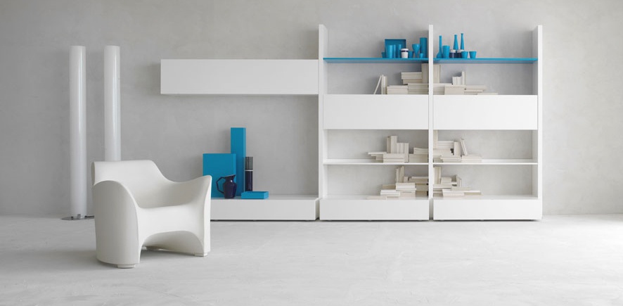 Modular storage system from Italian manufacturer Olivieri. Frame of furniture is made from solid wood. Color in light version with blue. The modern style of execution.