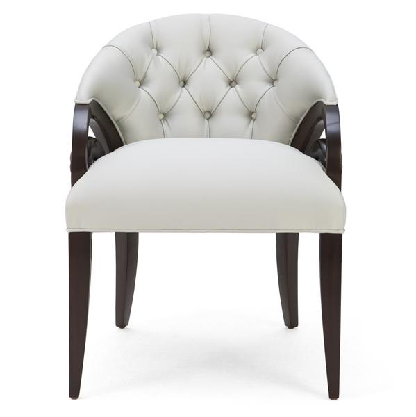 Chair with armrests Rue Cambon from an American manufacturer Christopher Guy. A product with a curved backrest smoothly into the armrests. Material - solid wood. The varnish finish offered from the company portfolio. Upholstery leather or textile to choose from. The model is decorated with stitch-Capito and carving.