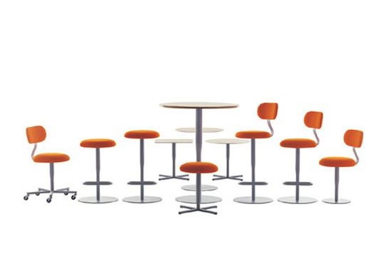 Bar table with round top made of aluminum or oak veneer and enameled steel leg of Atlas, Alias