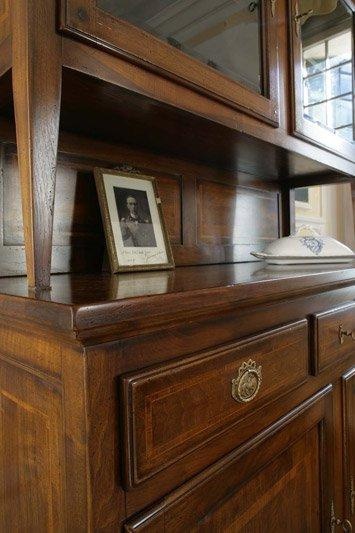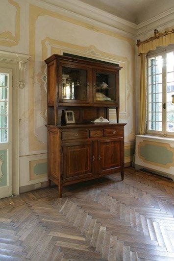The buffet from the Italian manufacturer Ca' d'oro. Includes sections with hinged and glass doors, two drawers and an open shelf. The frame and legs made from solid wood. Finish offered a choice from a range of companies. Sash glazed and deaf. Decorative metal fittings.