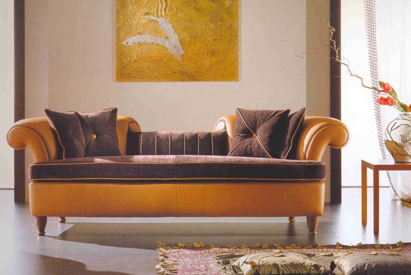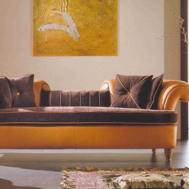 A double sofa from Italian manufacturer M&R. the Frame is made of solid wood of valuable breeds. Upholstery made of genuine leather and textile. Model on a low wooden legs, armrests, curved shape. The product will perfectly complement the interior in a classic style.