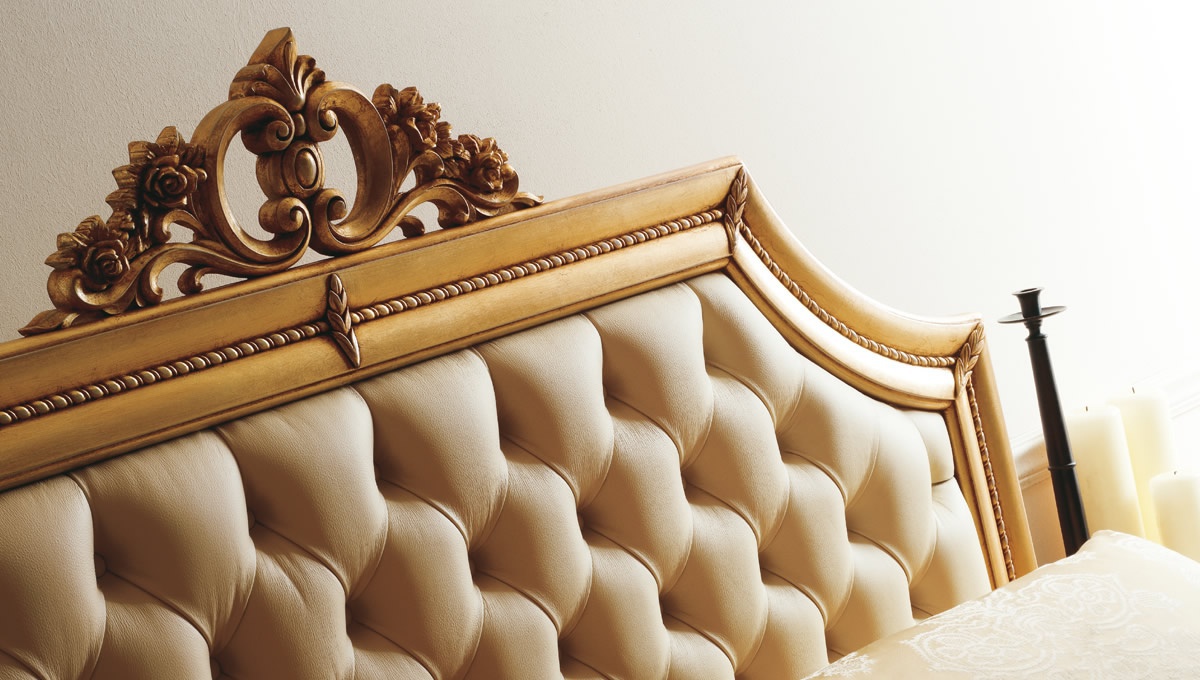 Bed with upholstered headboard Letto Ines from the Italian manufacturer CorteZari. The frame is made from solid wood, upholstery - leather or textiles from a range of campaigns. Double model with high headboard is designed for bedrooms in classic style. Product color ivory.