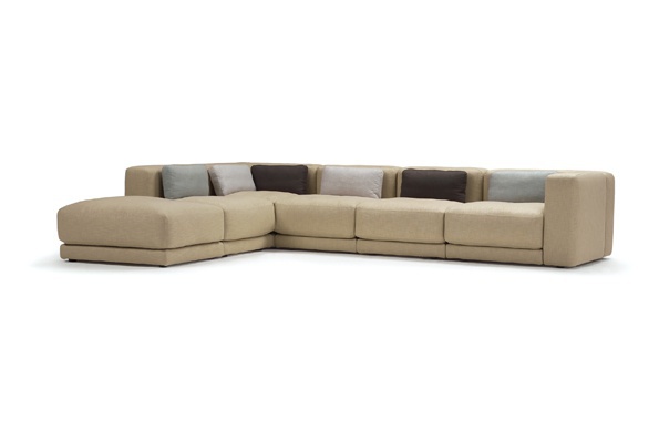 Corner sofa from Italian producer Calia Italia. Model with low square back and one armrest. Frame made of solid wood. The upholstery is leather or textile. It provides multiple colors from the collection company. The filler is not deformable polyurethane foam. Complement the design of decorative pillows.