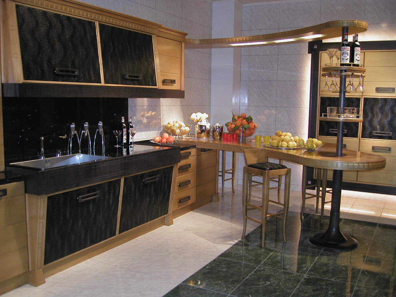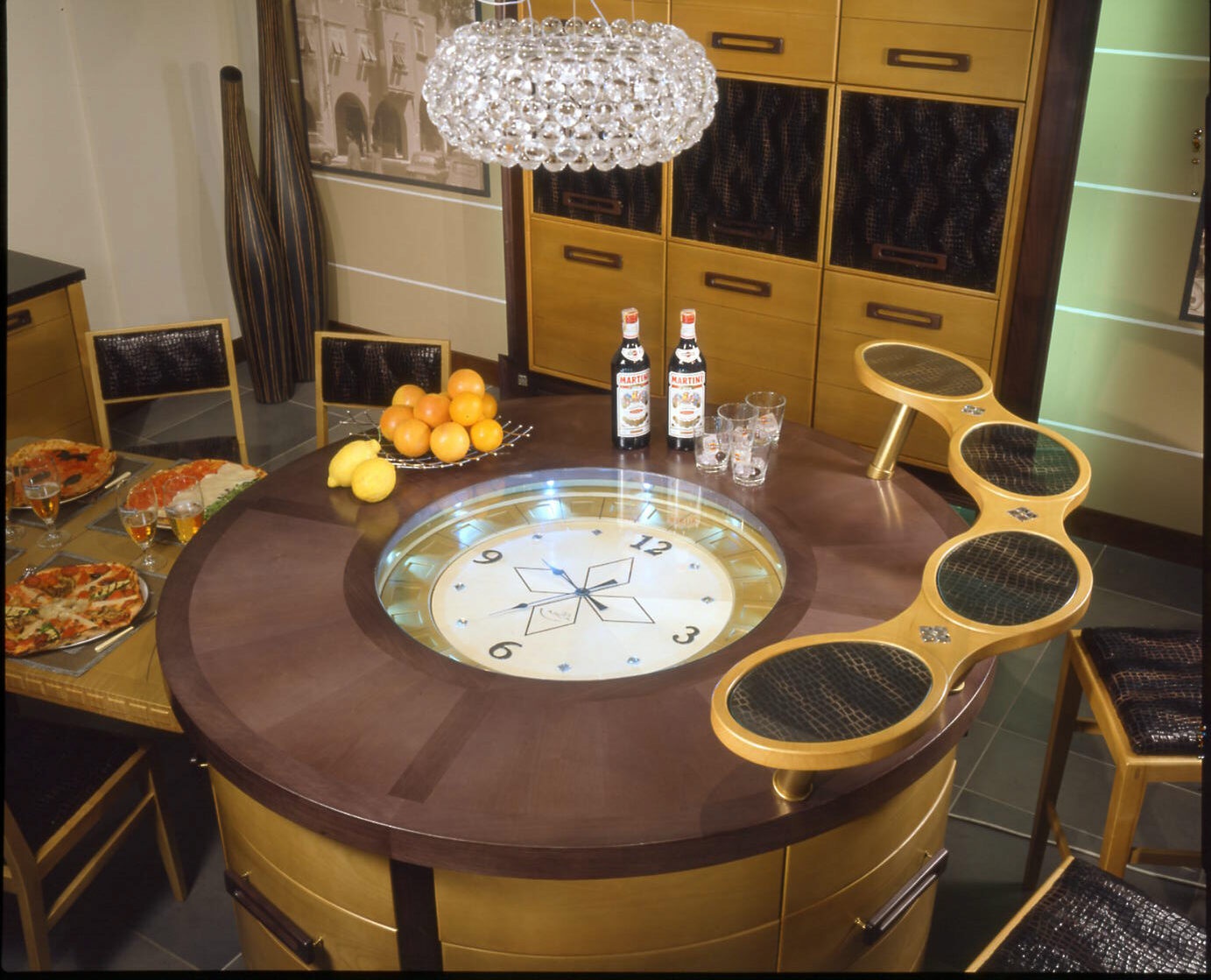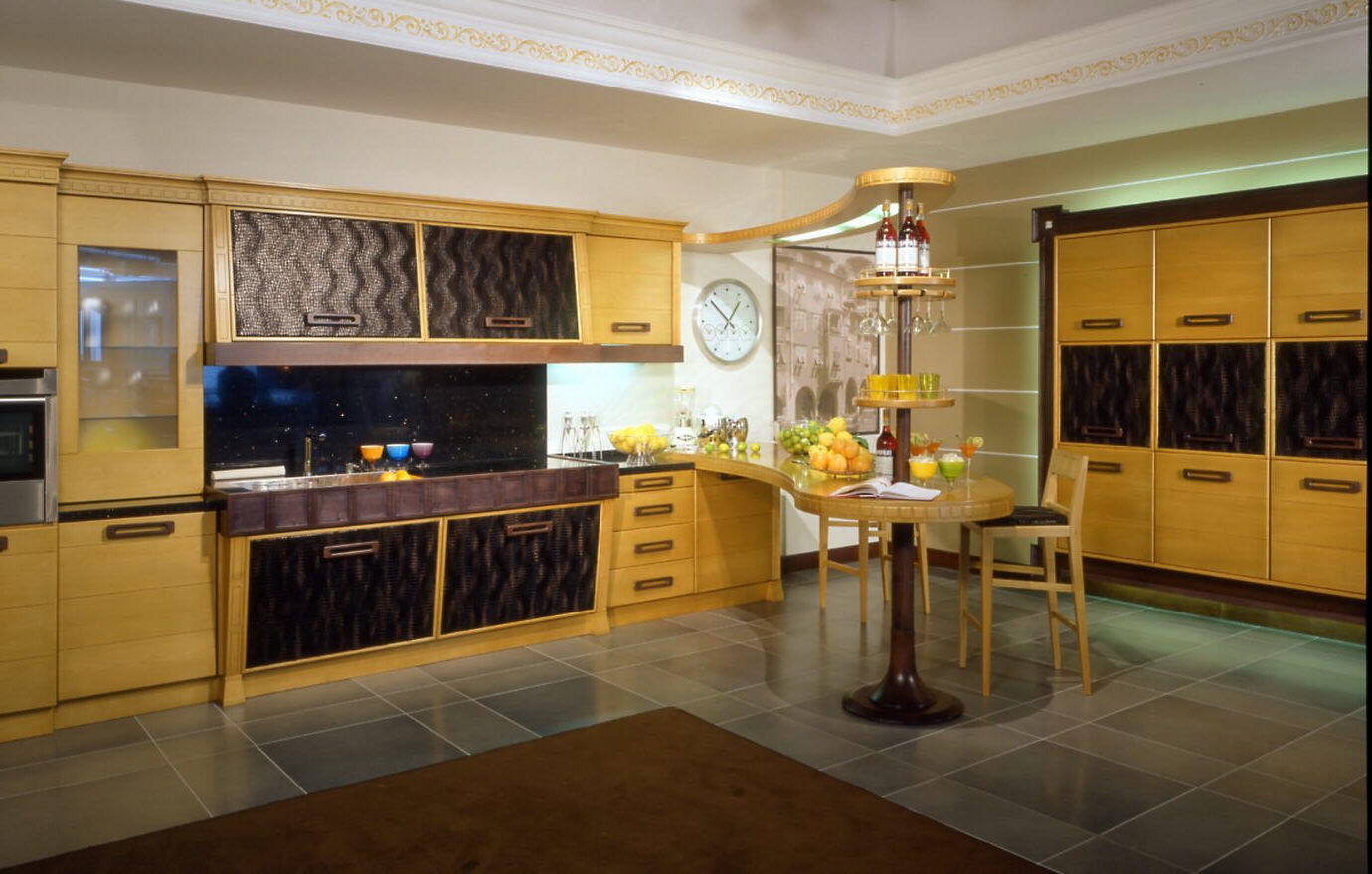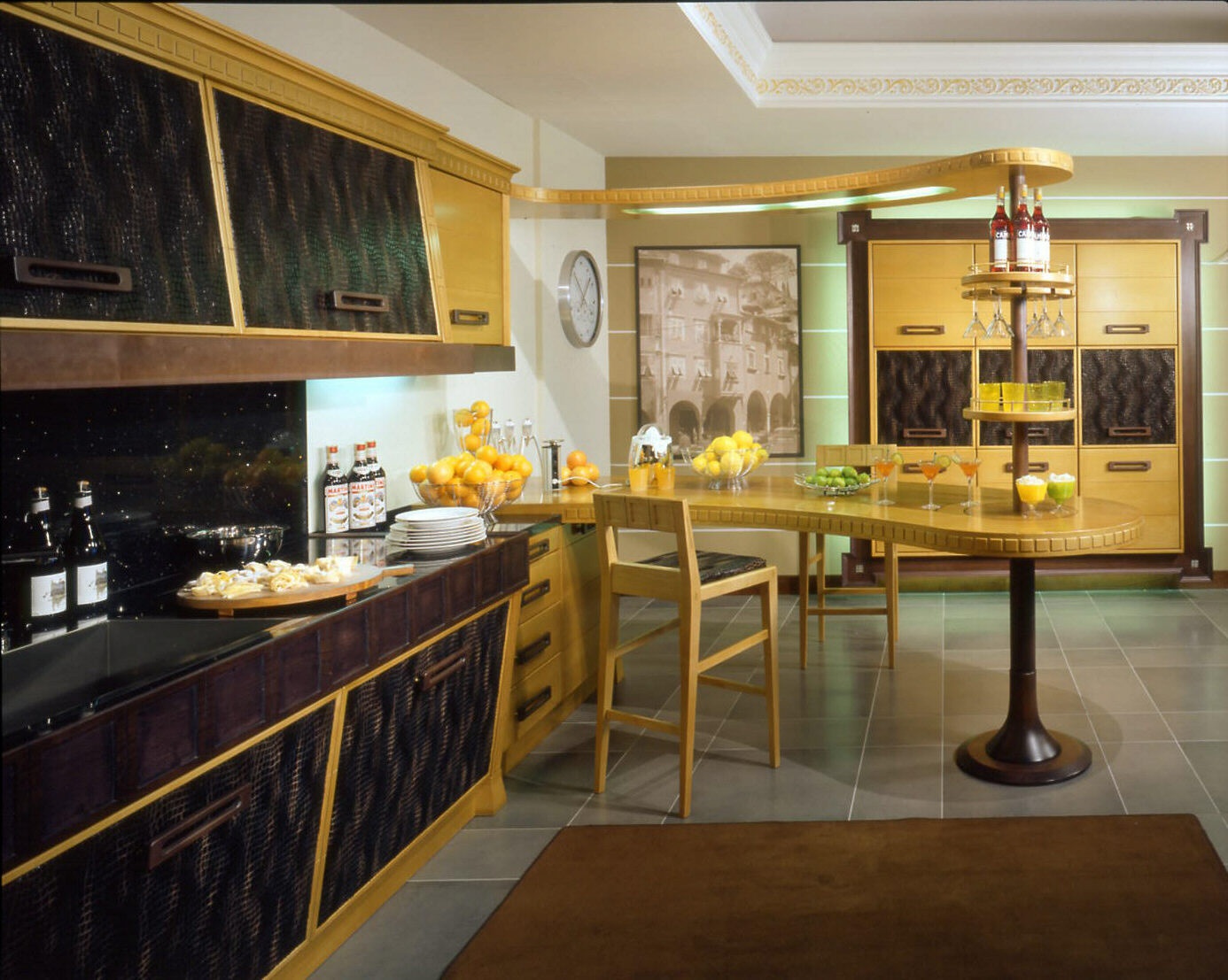 Kitchen with island and Breakfast bar from the Vogue collection Orizzonte from the Italian manufacturer Arca. The furniture is made of natural wood. The surface is treated with varnish from the range of the factory and decorated with natural leather. Colours in stock.