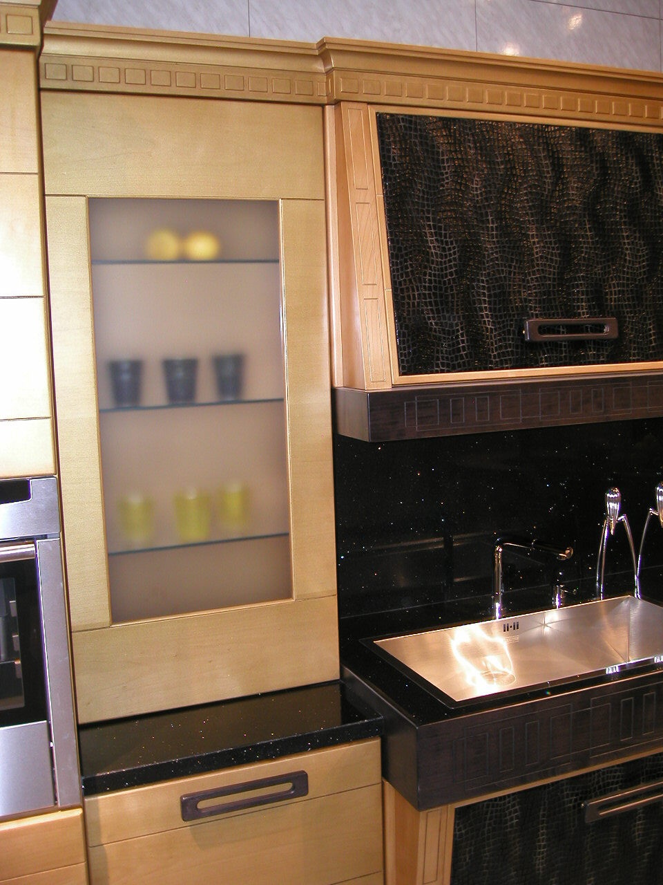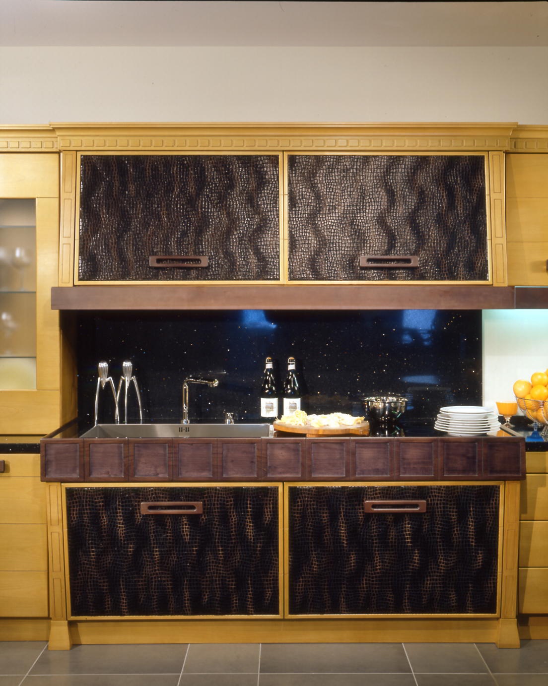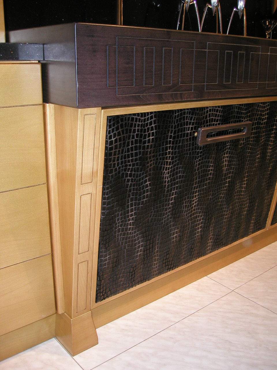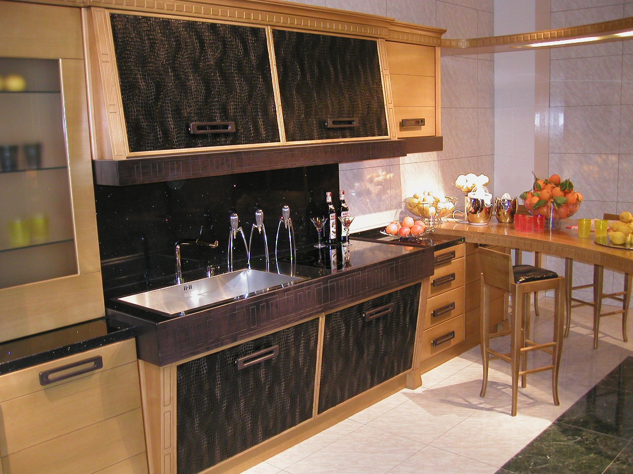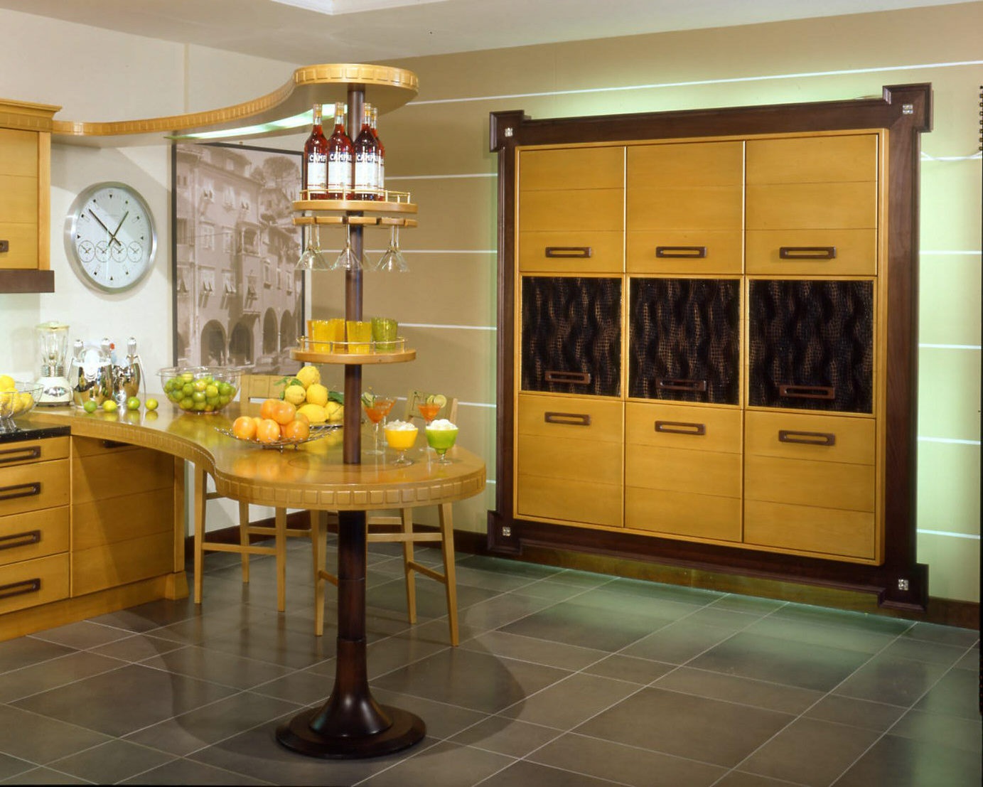 Kitchen with island and Breakfast bar from the Vogue collection Orizzonte from the Italian manufacturer Arca. The furniture is made of natural wood. The surface is treated with varnish from the range of the factory and decorated with natural leather. Colours in stock.