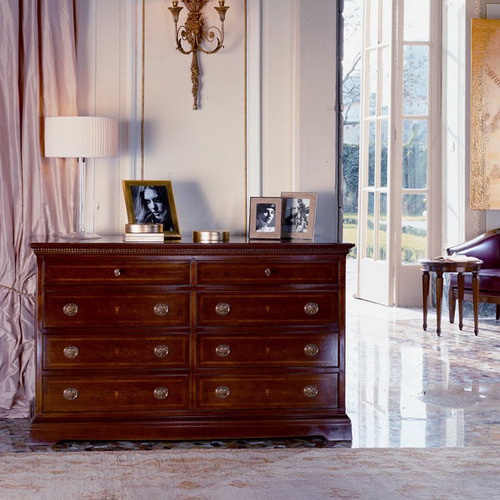 The Melograno chest of drawers from Italian manufacturer Le Fablier. Includes eight drawers. The body is made of solid wood. The surface can be processed with a matte or glossy varnish. Accessories made of metal. The model is made in classic style.