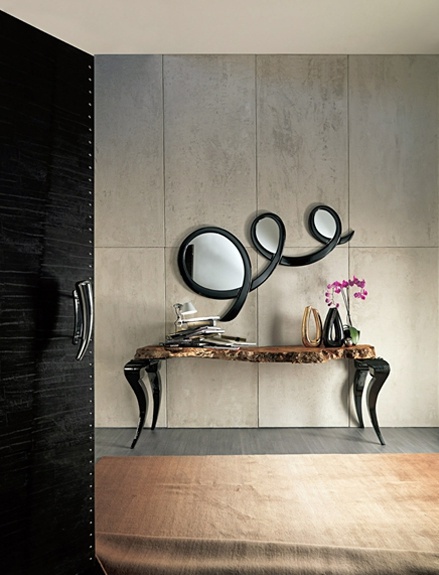 Console Sidney from the Italian manufacturer Bizzotto. Table top made from basal wood (radiaca), 200 year old trees. This tree is unique as it occurs in specific environmental conditions, such as floods, landslides, and therefore each product from the "radica" by their unique sizes and shapes. Legs are made of wood, covered with black glossy varnish. Design solution for modern interior dining room or living room.