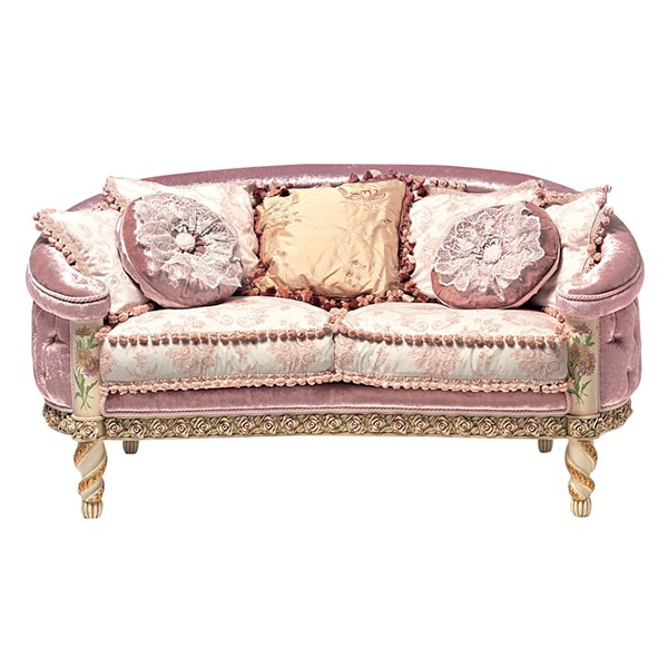 Double couch from the Italian manufacturer Riva Mobili d'arte. The frame is completely hidden. Legs are decorated with ornamental hand-carved. Upholstery textile from the company portfolio. Filler - fluff and foam. In addition, enjoy the many pillows of different sizes. The model is made in classic style.