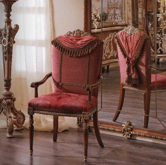 Armchair from Italian manufacturer Riva Mobili d'arte. Legs and frame made of solid wood. The surface is treated by high gloss or Matt lacquer. Upholstery textile from the company portfolio. The armrests hard. The model is decorated with carvings made by hand.