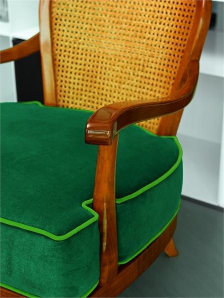 The armchair from Italian manufacturer Salda. Made in the classic style. The frame and legs of solid wood. The back is decorated with handmade lace work. Finish - gloss lacquer. Seat cushion is removable. Filler - fluff or a feather. Completes the design a little lumbar pillow.