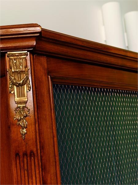 Showcase with hinged doors from Italian manufacturer Salda. Made of solid wood. The surface is lacquered and polished. In the corners are decorated with decorative mesh and the bottom blank. Inside there are shelves for storage. Made showcase in classical style.