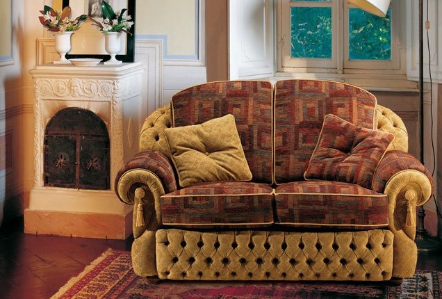 Sofa Giuditta - Siviglia from the Italian manufacturer BM Style. Filler - foam, upholstery - textiles from a range of campaigns. Seat and back are removable. The design of complementary decorative pillows. Double model with a high back. The perfect choice for a living room in classic style. Colors: Golden, red.