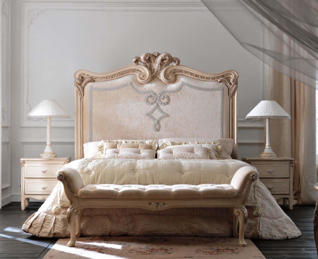 Double bed Ambiente Notte from the Italian manufacturer Savio Firmino. Frame made of solid wood. The product with high upholstered headboard, fitted high quality fabrics or leather to choose from. Extensive colour range, pastel warm colors, so saturated and dark, to choose from a catalog company. Decor presents rich carvings handmade. The surface is lacquered from a range of companies, with gold leaf. Style classical, depending on colors and textures, the product can be easy elegant, or strict and solid.