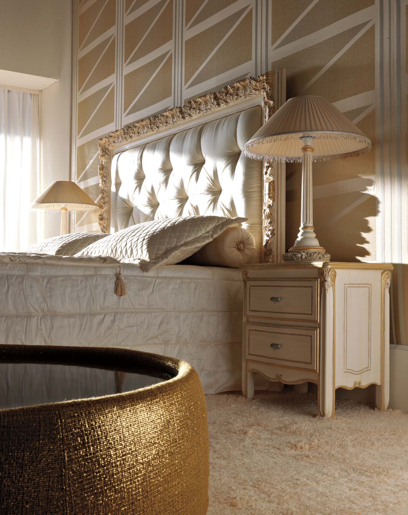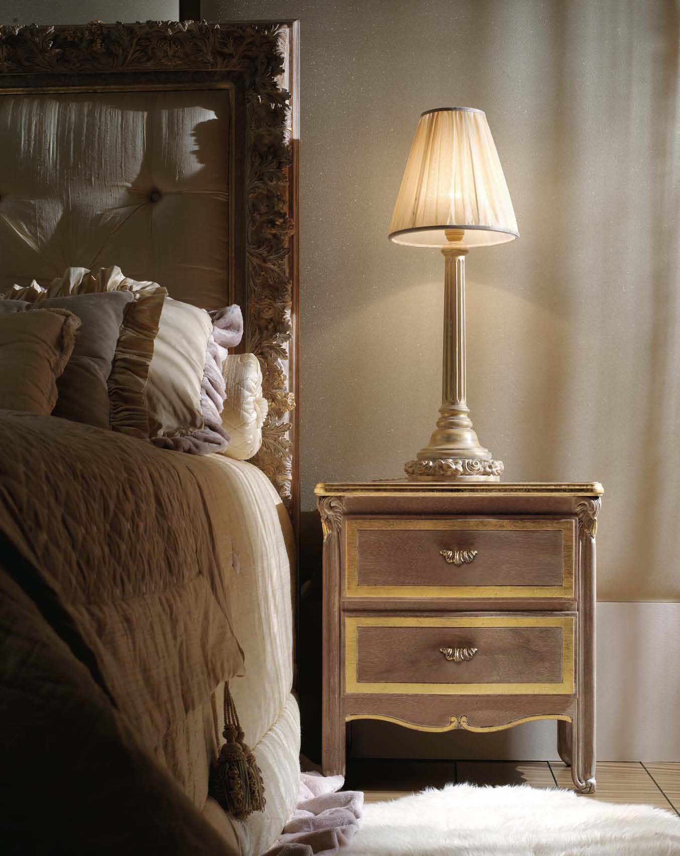 Bedside table bedside Ambiente Notte from the Italian manufacturer Savio Firmino. Includes 2 drawers. Material - solid wood. The surface of artificially aged and varnished. The individual elements covered with gold leaf. Decorative metal fittings. Color: milk, Golden, steel. The model is made in a classic style with a hint of Baroque. The model is perfect for sophisticated bedrooms.