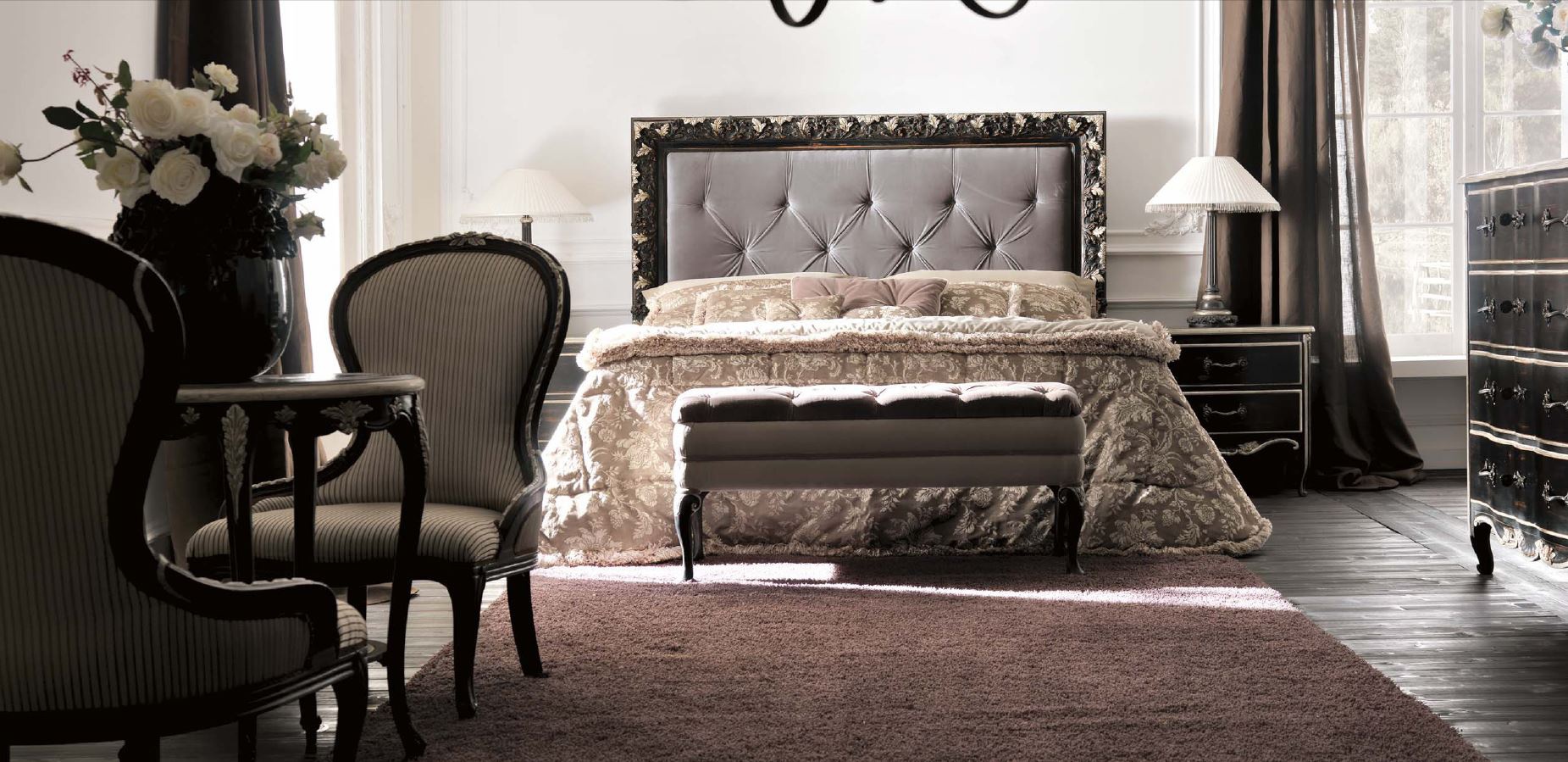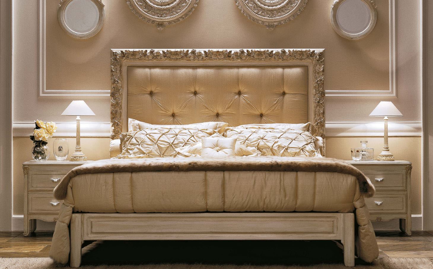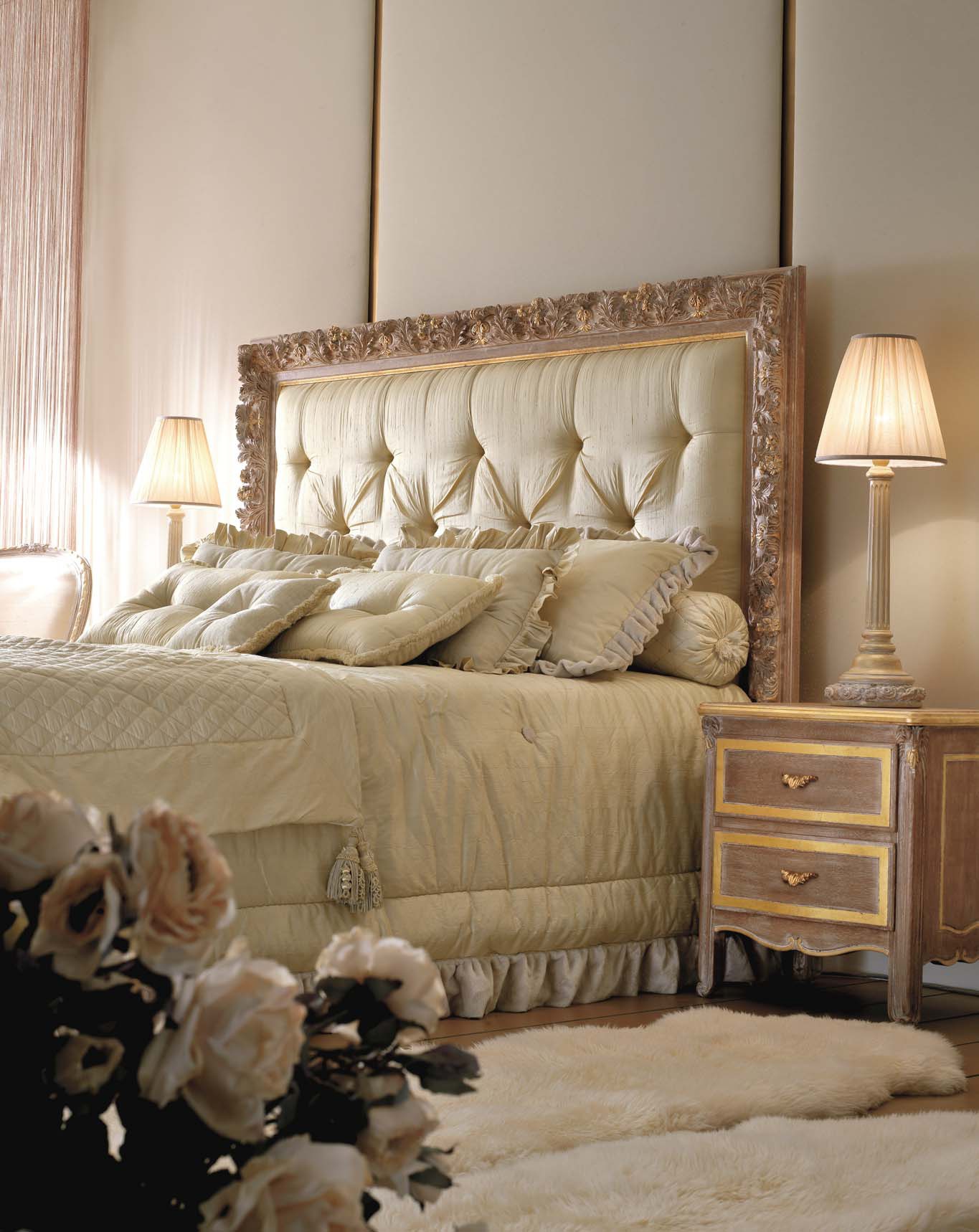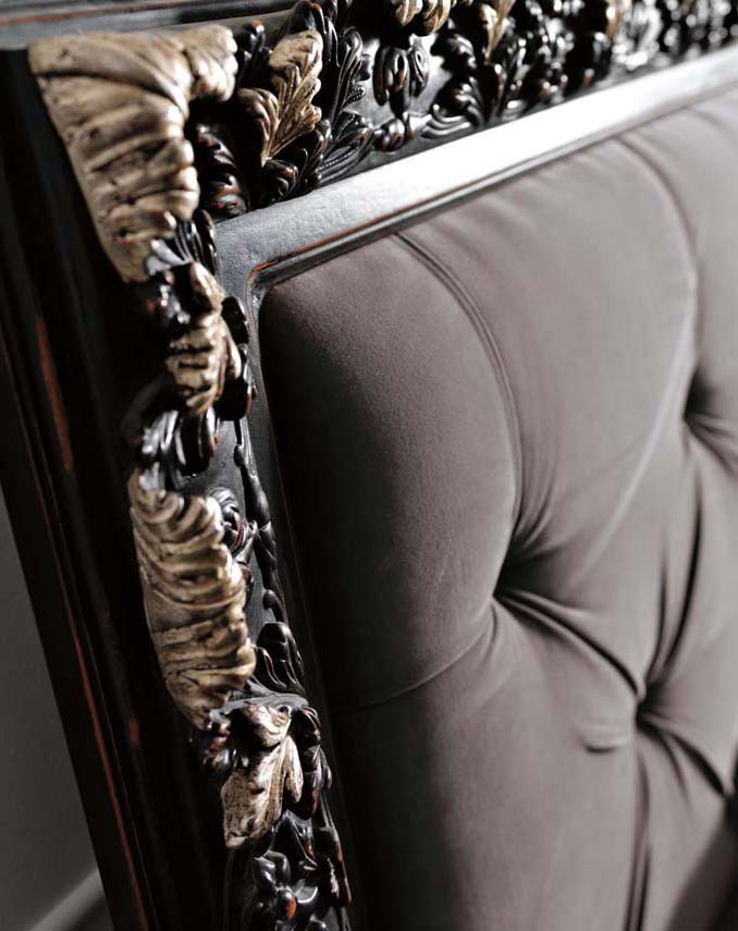 Double bed Ambiente Notte from the Italian manufacturer Savio Firmino. Made of solid wood. Colour, texture, finish of your choice from the collection of the company. High headboard covered with textiles. The model is decorated with carvings and handmade with stitch-Capito. The model is made in classic style.