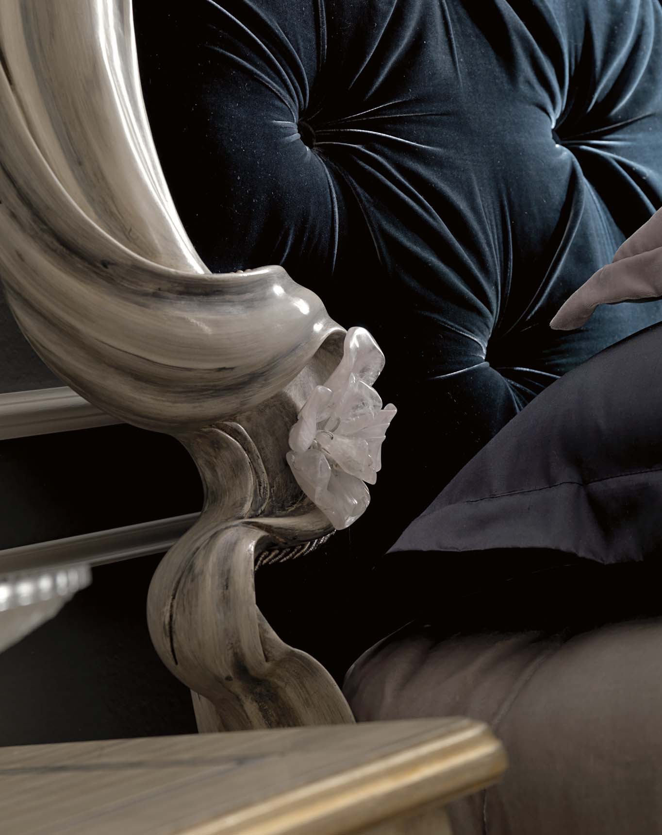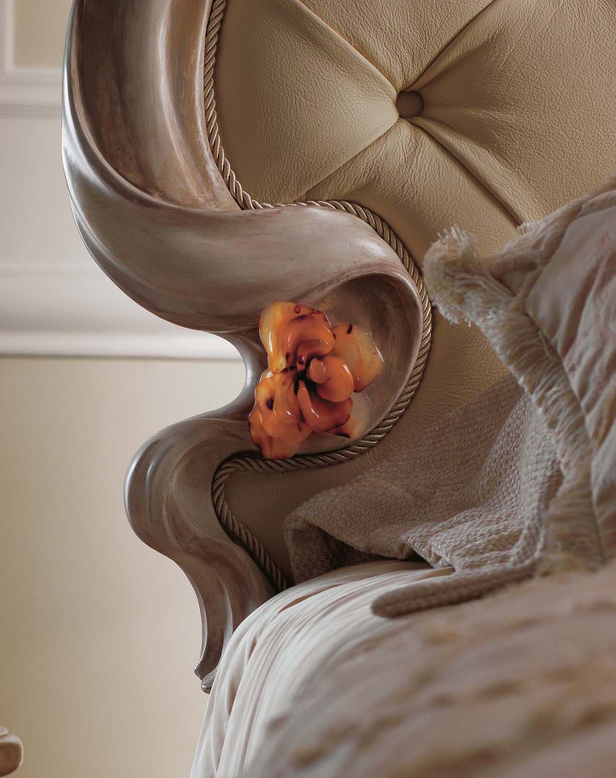 Double bed Ambiente Notte from the Italian manufacturer Savio Firmino. The model is made in classic style. The frame and legs are made of solid wood. The glossy lacquer finish is offered from the assortment. Upholstery textile/leather from a range of companies. The ornament serves as a decorative stitch-Capito.