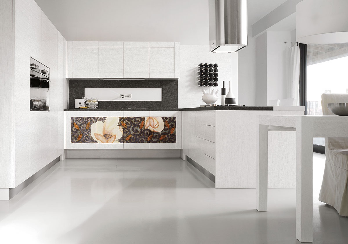 Set for kitchen Creators of Emotions from the Italian manufacturer MOD'...ART. Set in a modern style with elements of glamor. Set consists of a corner of the working area, overhead cupboards and a massive Cabinet for built-in appliances, cupboard. Furniture made from solid chestnut. Tabletop of stone. The facade is decorated with painted ceramic decoration. Colors represented the headset is white with bright floral elements. It should be noted that the stone for countertops, ceramic decor and lacquer - based on manufacturer's catalogue.