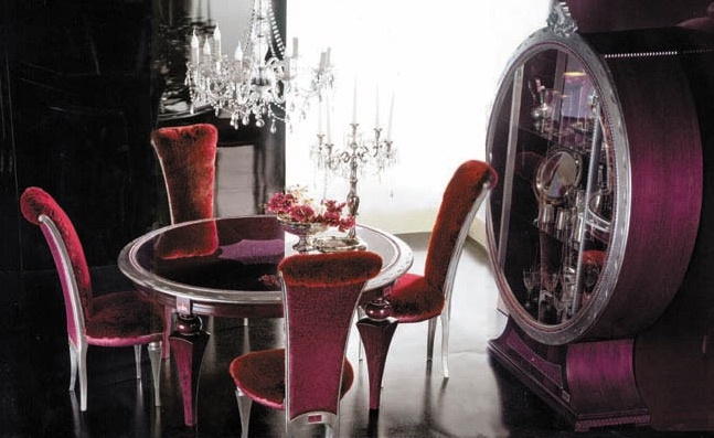 To set Tiffany dining room from Italian manufacturer AltaModa. Set includes dining table rectangular chairs with padding and high back and showcase. The furniture is made of solid wood. Lounge in classic style. Colours in stock.