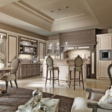 Sofa set Italian producer of Martini Mobili. The furniture for kitchen with bar counter made of solid wood, covered with a light varnish. A model of dining table with high chairs with oval backs in white. Set in white and grey tones. The modern style of execution.