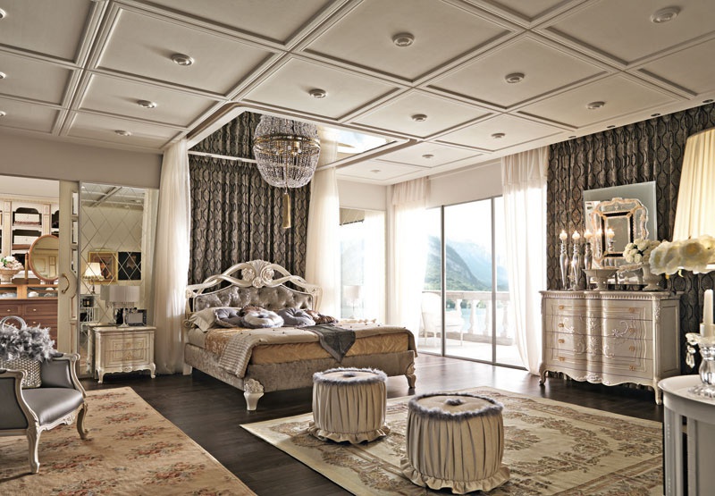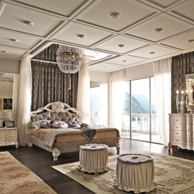 Set for bedroom Italian producer of Martini Mobili. This headset presents the model of a double bed, bedside tables and drawers for clothes and a round poof. Color this headset light. A style classic.