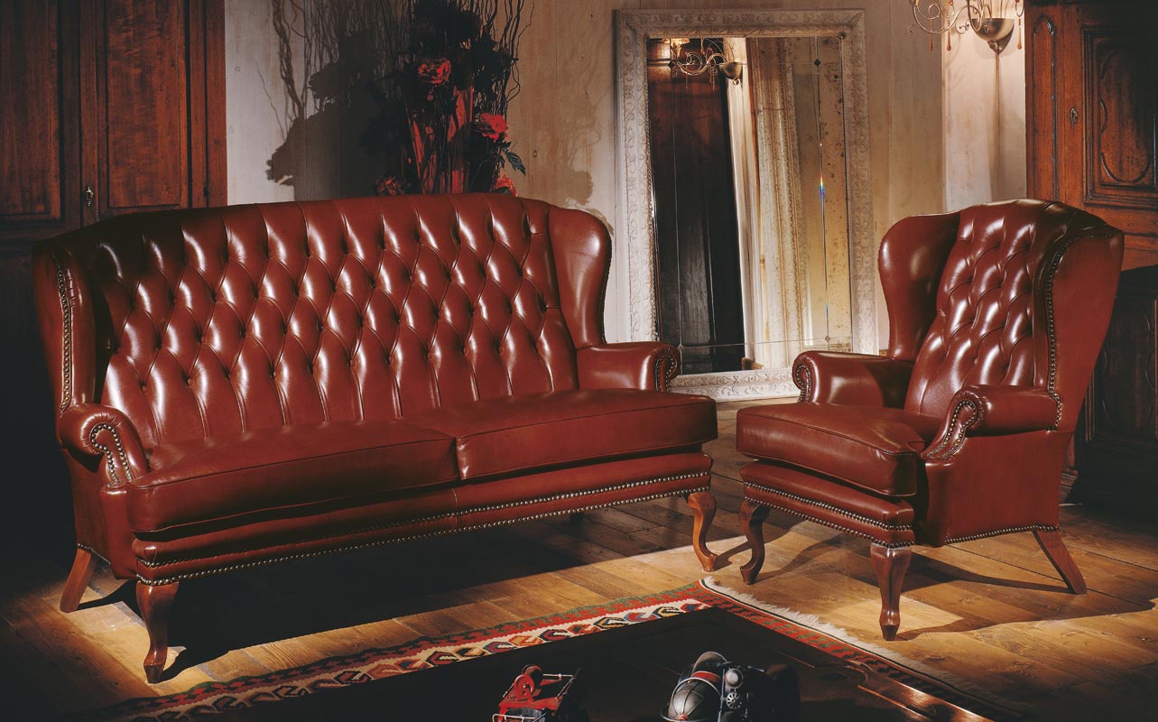 Cecile sofa set from the Italian manufacturer Poles Salotti. Set consists of double sofa and armchairs. The furniture is executed in classical style, embellished with decorative nails for furniture. Frame - wood. Upholstery fabric - genuine leather from the collection company. Colours in stock.